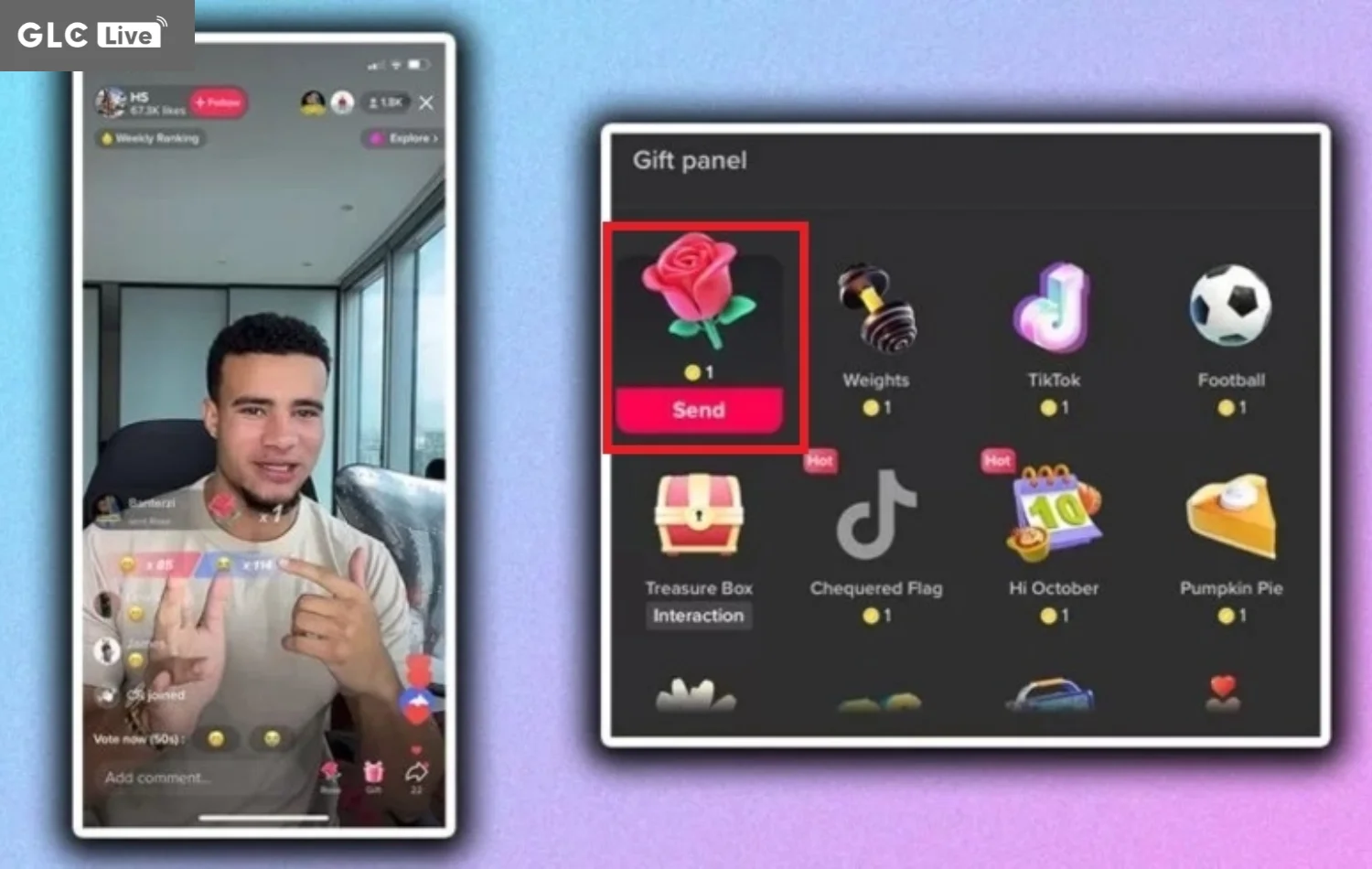 Khi bạn đang xem video hoặc livestream của nhà sáng tạo, hãy nhấn vào biểu tượng quà tặng xuất hiện trên màn hình. Lúc này, một danh sách các món quà sẽ hiện ra – trong đó có cả hoa hồng để bạn lựa chọn và gửi tặng.